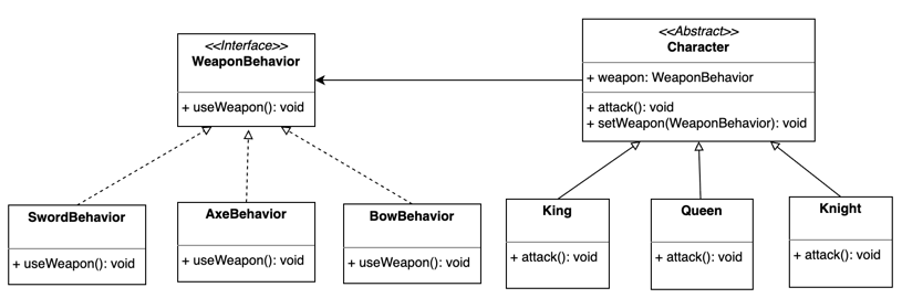 행동 인터페이스인 WeaponBehavior를 구성 하지않고 캐릭터 클래스에서 attack() 메서드 대신useWeapon() 메서드를 캐릭터 클래스 내에서 사용할 수 있다고 생각할 수 있다.
