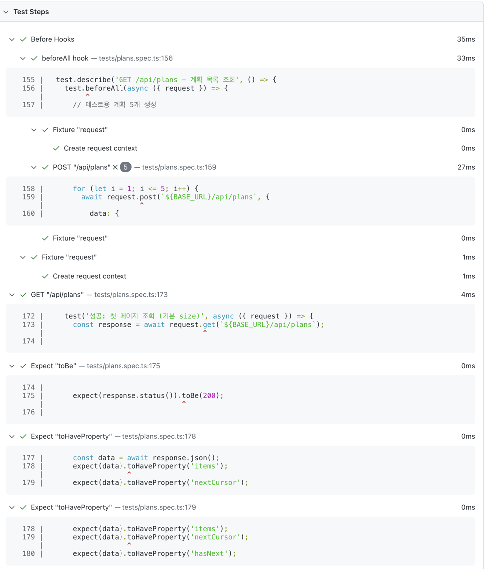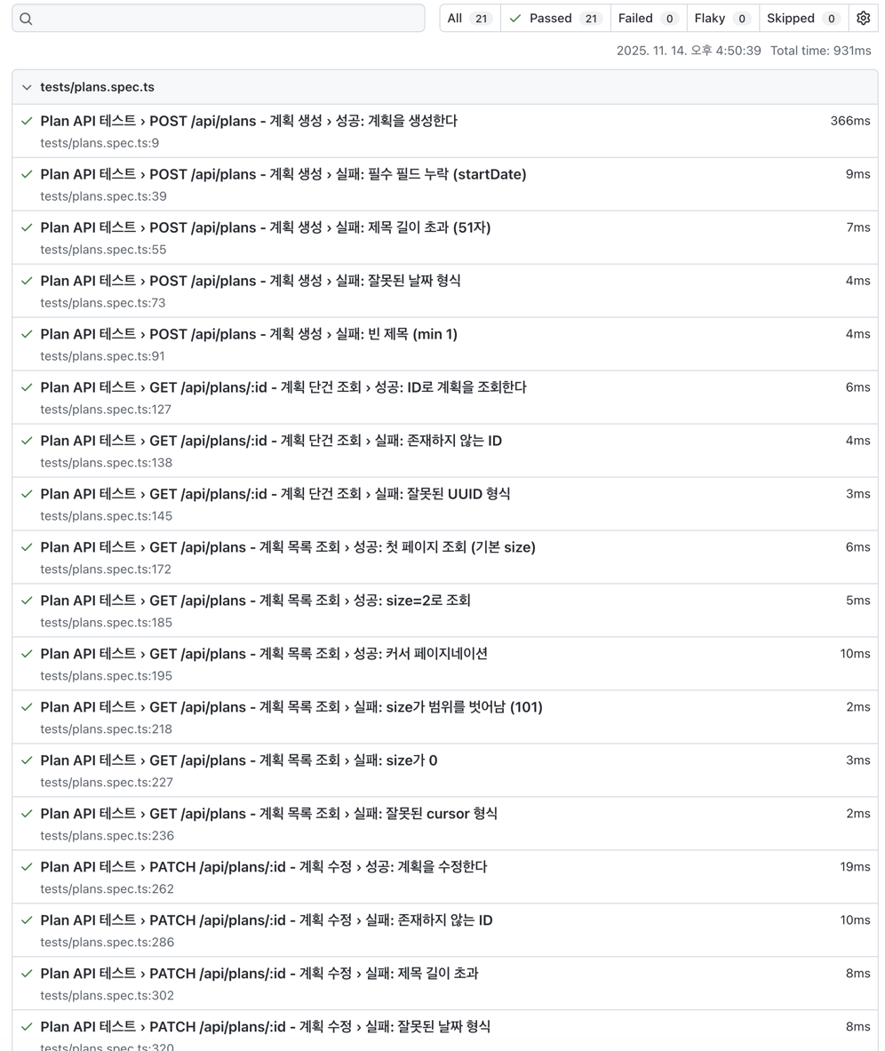 에이전트가 생성해준 테스트코드 중 일부분인 계획생성 API 테스트코드이다.